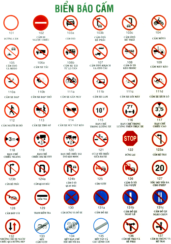 Biển báo đường cấm tất cả các loại phương tiện tham gia giao thông đi vào theo chiều đặt biển, trừ các xe được ưu tiên theo Luật Giao thông đường bộ gồm có 40 kiểu được đánh số thứ tự từ biển số 101 đến biển số 140 nhằm báo các điều cấm hoặc hạn chế sự đi lại.